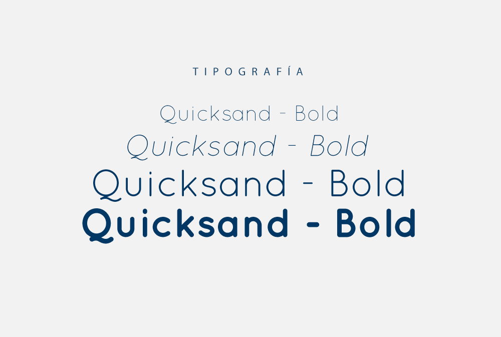 - La tipografía Quicksand Bold se caracteriza por su estilo sans serif geométrico, moderno y amigable, que transmite cercanía, claridad y accesibilidad visual. Sus formas redondeadas y equilibradas generan una sensación de dinamismo y calidez, alejándose de la rigidez de las tipografías tradicionales y conectando con una comunicación más humana y contemporánea.
